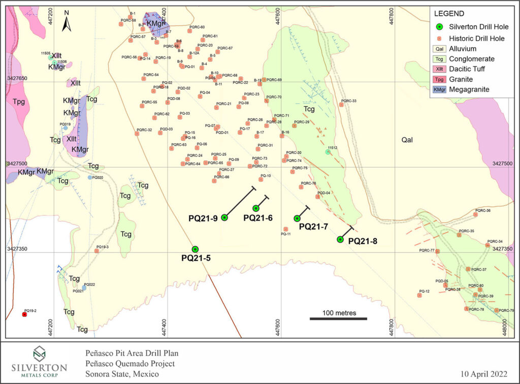 Drill hole PQ21-8 located southeast of the eastern limit of the Peñasco Pit historic resource estimate prepared by Silvermex, extended the silver mineralization approximately 100 meters in said direction. This hole, in conjunction with several other holes drilled by previous operators east and outside of the Silvermex historic resource estimate, expand the Peñasco Pit mineralization by an additional 300 meters along strike, for a combined total expansion of 400 meters from the deposit. See, for example, drill holes PQRC-37, PQRC-39, PQRC 79, and PQRC-80 which report average silver grades of 72 g/t, 75 g/t, 176 g/t and 186 g/t over 12 meters, 7.5 meters, 3 meters and 16.5 meters respectively (view here: https://silvertonmetals.ca/projects/summary).