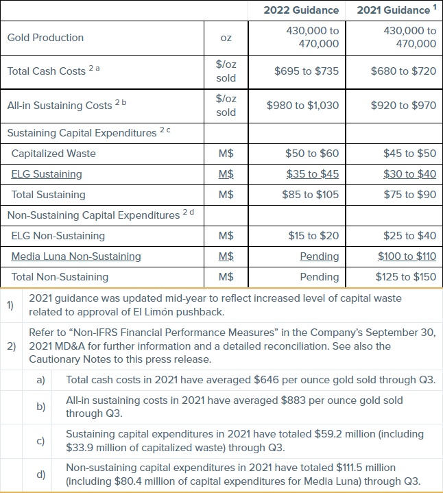 “The forecast increase in all-in sustaining costs at ELG is due to a higher level of waste mined and select additional fleet rebuilds. Both elements directly relate to the previously announced expansion of the El Limón pit, which will extend open pit mining from late-2023 to mid-2024 and provide additional confidence in a smooth transition from ELG to Media Luna. Exploration will also remain a key focus, with a total of $39 million in exploration and drilling planned in 2022 with the intent to grow the overall resource and reserve base.