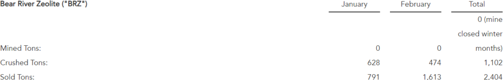 The new classification machine for Line #1 was designed and ordered in February and scheduled to ship March 18th. Two new motors on two different machines for the crude size-classification of zeolite in the crushing process were ordered and received and are going to be installed to replace existing ones with bad bearings. Multiple, previously delinquent accounts with vendors for equipment have been addressed and corrected. Improvements to the new jaw crusher were made that eliminated vibration. The apron feeder speed controller was improved and a bad apron segment replaced. Two base-unit radios were purchased for use in the crusher room and office to aid in plant-wide communication. Three employees were replaced and two were let go. A secondary stockpile patio was created and is planned to store extra mined ore for access during winter months to improve production capacity during winter. USAC received approval from Cat Finance and has agreed to purchase a Cat 740 haul truck to replace the aging one that was in service. USAC intends to purchase a replacement for its 988B loader to further aid in production.