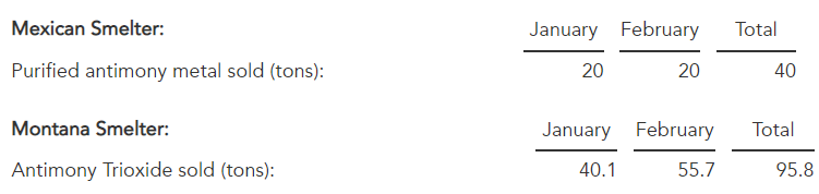 The Mexican Smelter operations continued to produce finished antimony metal. For this period, two truckloads of finished metal were produced and sold.