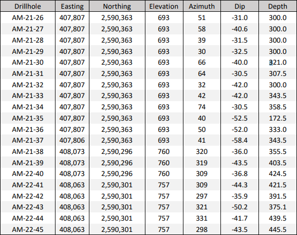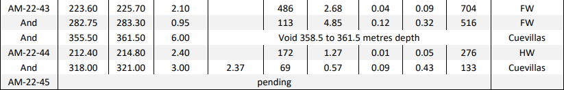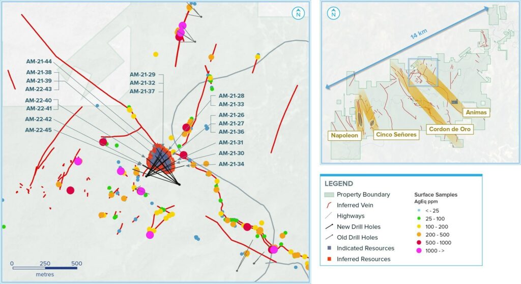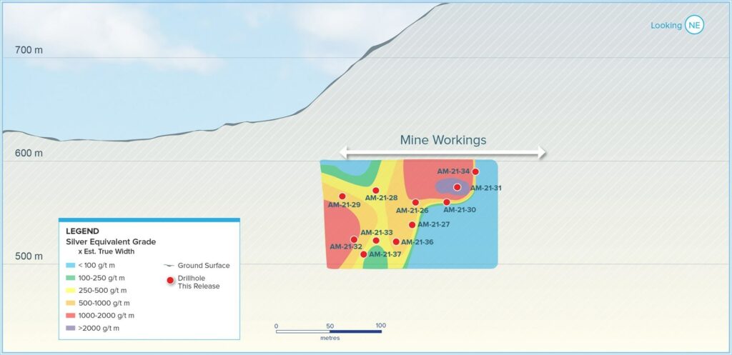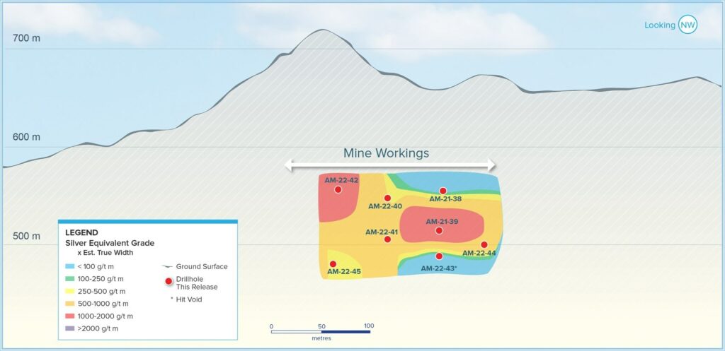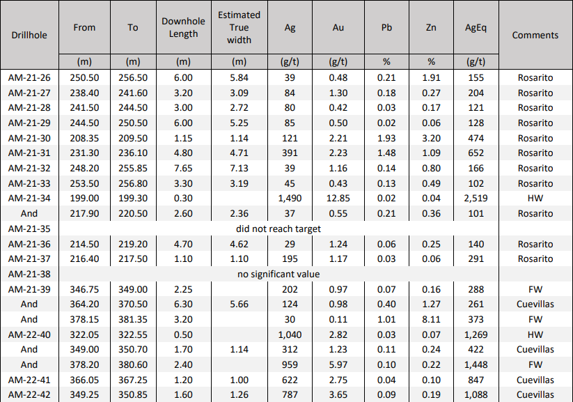 - Cuevillas: AM-22-42 returned 1,088 grams per tonne (g/t) silver equivalent (AgEq) over 1.26 metres true width (mTW) (787 g/t silver, 3.65 g/t gold, 0.09 % lead and 0.19 % zinc)
