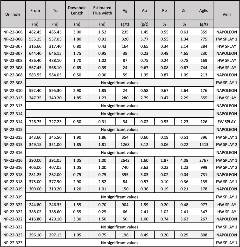 - NP-22-316 returned 2,767 grams per tonne (g/t) silver equivalent (AgEq) over 1.00 metres true width (mTW) (2,642 g/t silver, 1.60 g/t gold, 1.87 % lead and 4.08 % zinc) and,