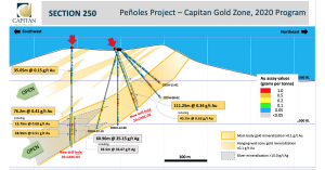Capitan’s CEO, Alberto Orozco, stated: “We are very excited to receive the first batch of drill hole assays from our program on Capitan Hill at the Peñoles Project. This first batch of drill holes demonstrates strong continuity of gold-silver mineralization, particularly down- and up-dip; and they are also showing silver mineralization at depth to be more significant than previously thought.”