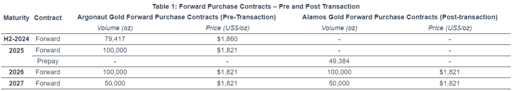As part of the recently closed acquisition of Argonaut, Alamos inherited Argonaut’s hedge book which included gold forward purchase contracts totaling 329,417 ounces between 2024 and 2027. The average forward prices on the contracts ranged between $1,821 and $1,860 per ounce (Table 1). The transaction has closed out all of the 2024 and 2025 forward purchase contracts.