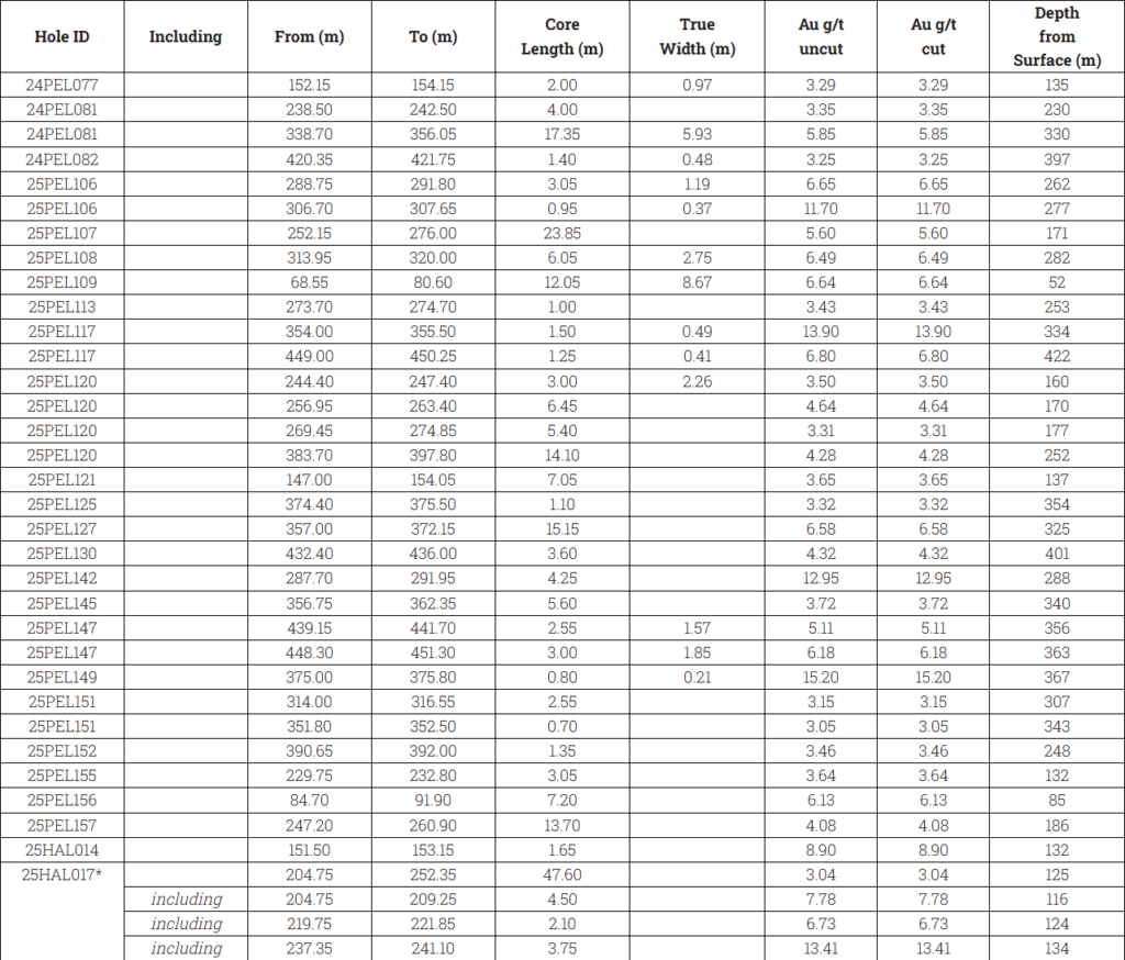 - 6.13 g/t Au over 7.20 m (25PEL156); and