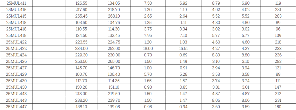 | 25MUL447 | 287.0 | -84.0 | 222.0 | 721504.0 | 3171387.0 | 1248.0 |