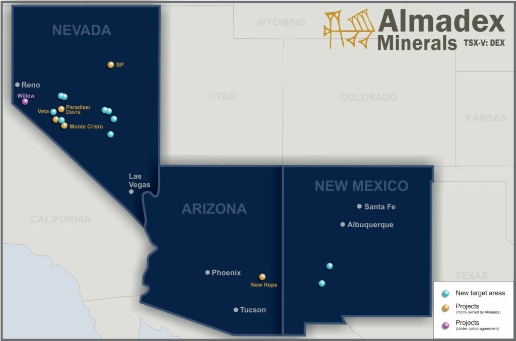 Further to its news release of July 11th 2023 describing the identification of new targets, Almadex has acquired by staking eight target areas in Nevada and two in New Mexico. These areas are considered prospective for gold and/or base metal mineralisation. Preliminary field work and sampling have recently been carried out on most of these areas. Once results have been received and compiled further updates on the potential of these new areas will be released. These ten target areas do not include the New Hope copper porphyry project in Arizona which Almadex has elevated to project status.