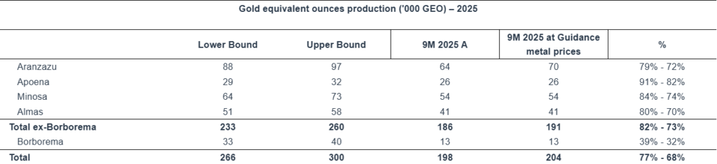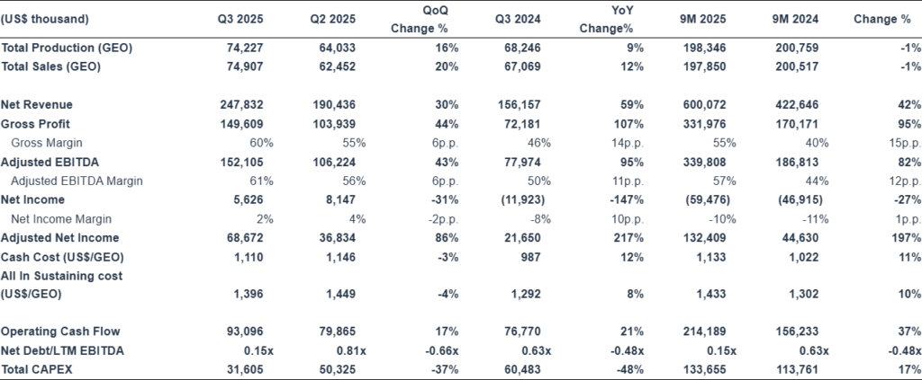 At current metal prices, production in Q3 2025 represents 75% of the lower end and 66% of the upper end of the full-year guidance. At 2025 Production Guidance Prices, the 9M 2025 production was 203,592 GEO, representing 77% of the lower end and 68% of the upper end of the full-year guidance. This performance reinforces the Company’s confidence in achieving its 2025 guidance.