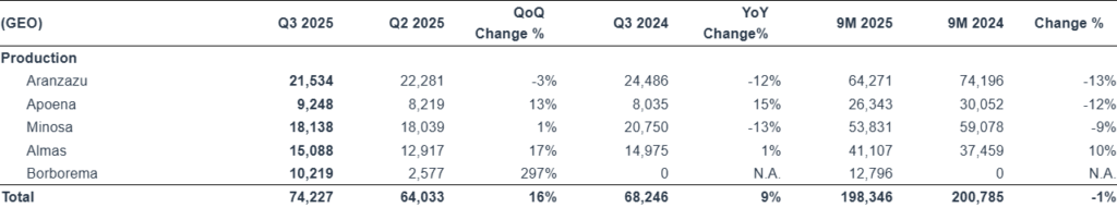 Borborema production in Q3 2025 totaled 10,219 GEO advancing along the ramp-up curve and achieving commercial production in September 2025 as scheduled.
