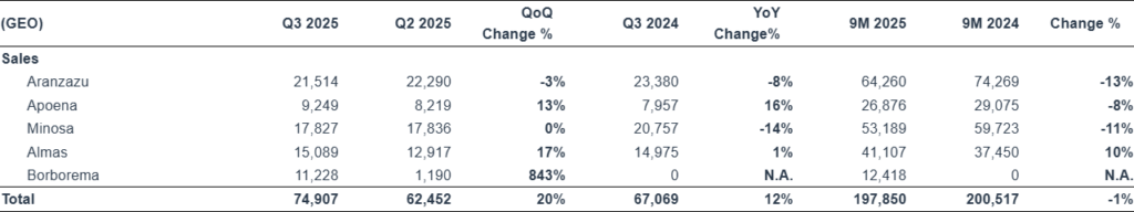 - Sales volumes were 74,907 in GEO this quarter, an increase of 10% compared to Q3 2024 and an increase of 20% compared to the previous quarter at current prices quarter, mainly as result of increase in production.
