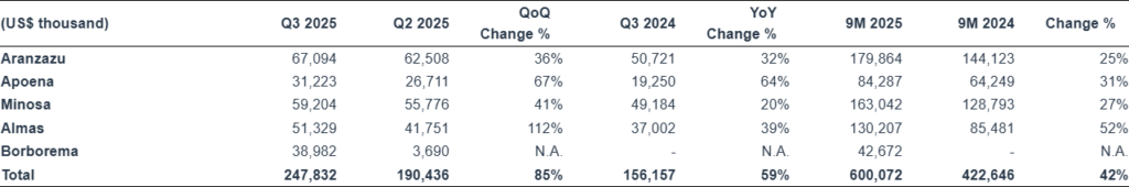 - The reliable productions at Apoena, Aranzazu and Minosa, which, combined, remained stable in Q3 2025 compared to Q2 2025