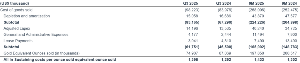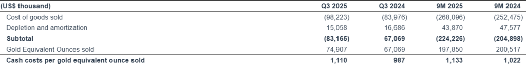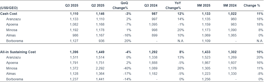 For Q3 2025, the Company’s Cash Cost was US$1,110/GEO, an increase of 12% over Q3 2024 mainly attributed to the increase in costs at Aranzazu, due to impact from the copper-to-GEO conversion in production, and lower production at Minosa. When compared to Q2 2025, Cash Cost was 3% lower, due to improvements at Almas and Apoena driven by higher grades and higher recovery rates, respectively, partially offset by higher costs at Aranzazu and Borborema.