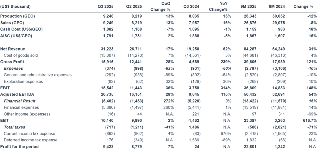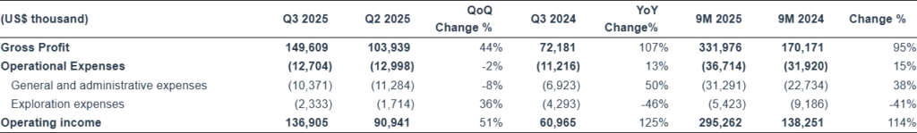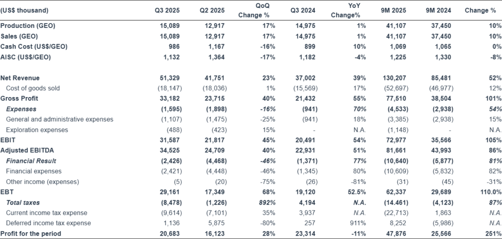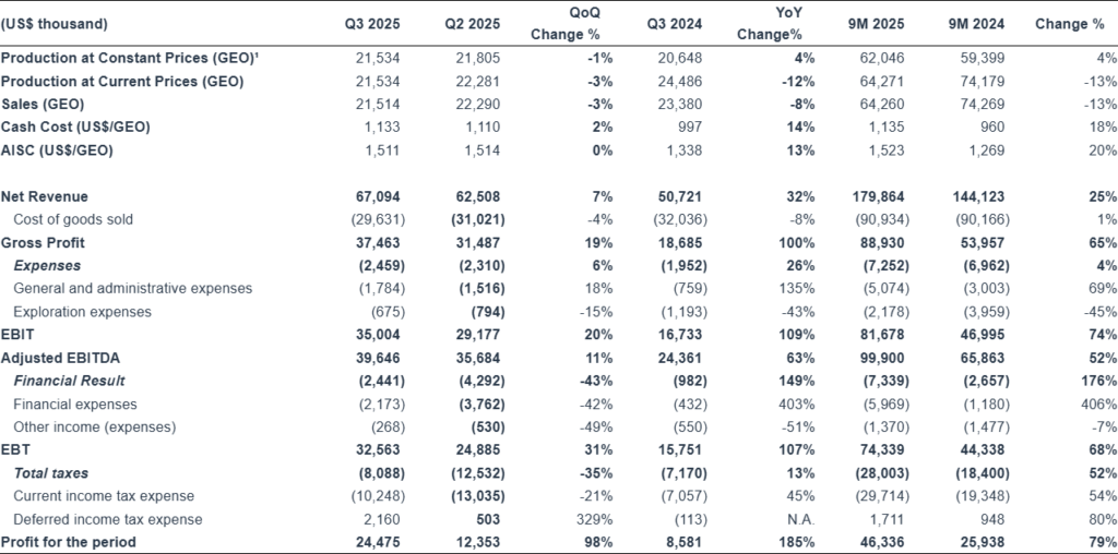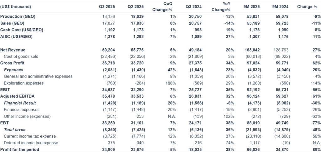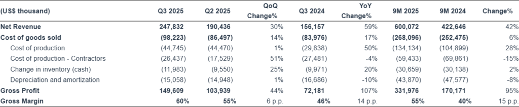 Net Revenue totaled US$59.2 million in Q3 2025, up 6% from Q2 2025, while in comparison to Q3 2024 it grew 20%, mainly due to the increase in the price of gold over the period. In 9M 2025, Net Revenue reached US$163.0 million, 27% higher than 9M 2024.