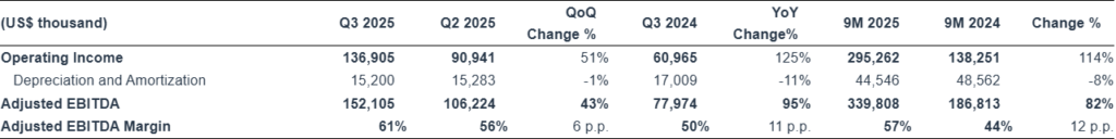 The Company thus ended Q3 2025 with Operating Income of US$137.6 million, compared to an Operating Income of US$90.9 million in Q3 2024, also higher compared to the Operating Income of Q2 2025 of US$90.9 million, which reflects a positive result of higher gross profit.