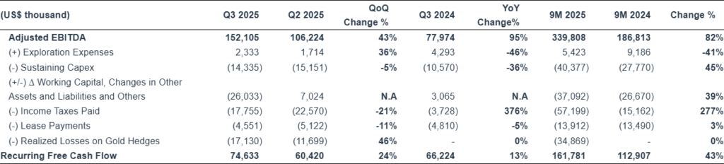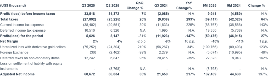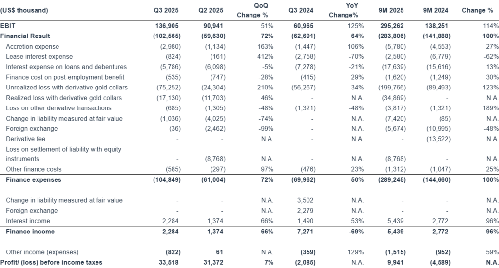 Net income in Q3 2025 was US$5.6 million, compared to Net Loss of US$(11.9) million in Q3 2024 and a Net income of US$8.1 million in Q2 2025. This result versus Q3 2024 occurred mainly due to higher operating income, which increased by 125% as a result of revenue growth, partially offset by higher financial expenses related to gold derivative losses and higher current income taxes, as expected given the operating income increase.