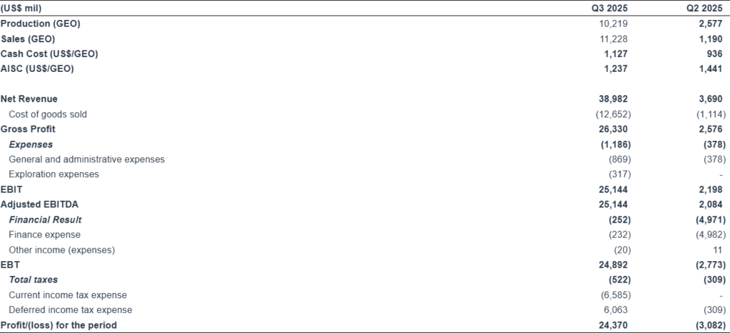 - The first full quarter of production at Borborema and its achievement of commercial production, producing 10,219 GEO in Q3 2025 (vs. 2,577 GEO in Q2 2025); and