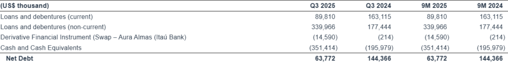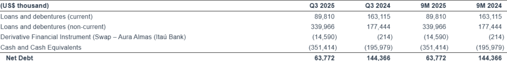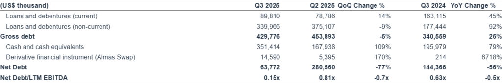 Total gross debt (short and long-term portion) was US$429,776 at the end of Q3 2025, a decrease when compared to U$453,893 at the end of Q2 2025. This decrease was mainly driven by interest and principal payments in the quarter.