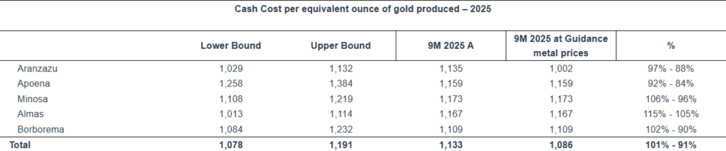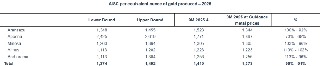 - AISC for Q3 2025 was US$1,396/GEO, a decrease by 4% when compared to Q2 2025 (US$1,449/GEO), mainly due to better performance at Almas (AISC of US$ 1,128/GEO) due to higher ore processed and better grades and improved waste-to-ore ration due to mine sequencing, and as result of the start of operations at Borborema, which while yet in a ramp-up had a lower-than-average AISC profile and recorded an AISC of US$ 1,237/Oz. When compared to Q3 2024, the AISC increased 8% over Q3 2024 at current prices, mainly due to Aranzazu, which was negatively impacted by the conversion of copper into GEO due to the sharp increase in gold prices in the period . At constant Q3 2024 metal prices, AISC would have been in line compared to Q3 2024. In 9M 2025, AISC reached US$1,419, an 8% increase when compared to 9M 2024 at current prices and 3% increase in constant prices.