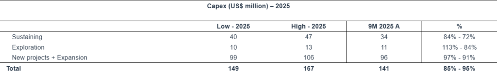 Aranzazu’s AISC was US$1,511 in the quarter, consistent with Q2 2025 but up 13% from Q3 2024, primarily due to variations in metal prices and increased G&A expenses. At constant Q3 2024 metal prices, AISC was US$1,273/GEO. For 9M 2025, AISC at constant metal prices reduced 5% from 9M 2024.