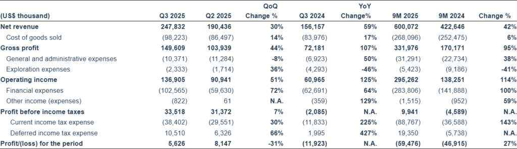 - Net Revenues reached a record high of US$247,832 in Q3 2025, representing an increase of 59% compared to Q3 2024 and an increase of 30% when compared to Q2 2025, mainly due to higher gold price and the increase in sales volumes. In 9M 2025, revenues reached US$600,072, an increase of 42% compared to the same period of 2024.