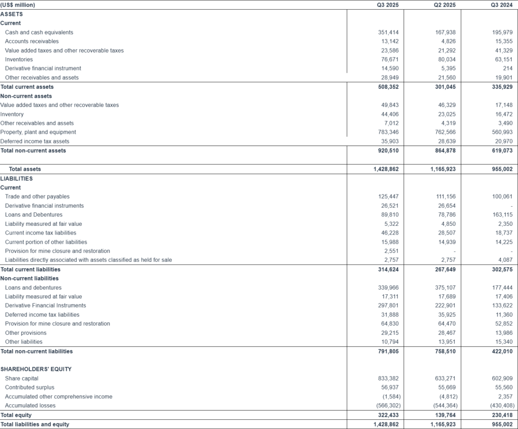 - Unrealized loss on gold hedges in Q3 2025, arising from mark-to-market (MTM) adjustments related to outstanding gold hedge positions, reflecting increase in gold prices between the start and the end of the quarter, coming from US$3,287.45 per Oz and reaching US$ 3,825.30 per Oz at the end of the period. In accordance with IFRS standards, the Company records MTM adjustments at the end of each reporting period for all outstanding derivative positions.