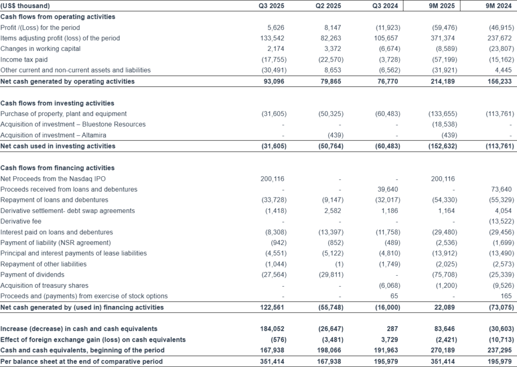 - 21% reduction in income taxes paid (from US$22.6 million to US$17.8 million), as in Q2 2025 there were annual adjustment tax payments in Minosa;