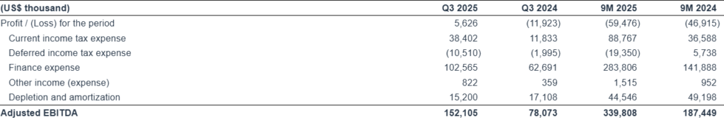 Adjusted EBITDA totaled US$34.5 million in Q3 2025, 51% higher than Q3 2024 result, driven by increased ore processing from the plant expansion, improved operational performance, higher sales volumes, and elevated gold prices. Compared to Q2 2025, Adjusted EBITDA rose 38%, primarily due to higher gold prices and a 17% increase in production volumes. For 9M 2025, Adjusted EBITDA was US$81.7 million, an 86% increase from 9M 2024, supported by higher sales volumes from expanded operational capacity, despite stable Cash Costs and an 8% reduction in AISC to US$1,223/GEO.