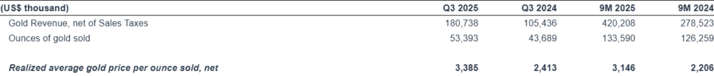 - Average net realized gold sale prices increased by 6% in Q3 2025 compared to Q2 2025, with an average of US$3,385/oz in the quarter. Compared to Q3 2024, average net realized gold sale prices increased 40% (US$2,413). In 9M 2025, average net realized gold sale prices reached US$3,146, a 43% increase when compared to 9M 2024.