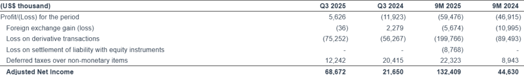 As result of increase in the Company’s Operating Income, adjusted net income in Q3 2025 was US$68.7 million in the period, compared to US$34.6 million in Q3 2024, excluding: