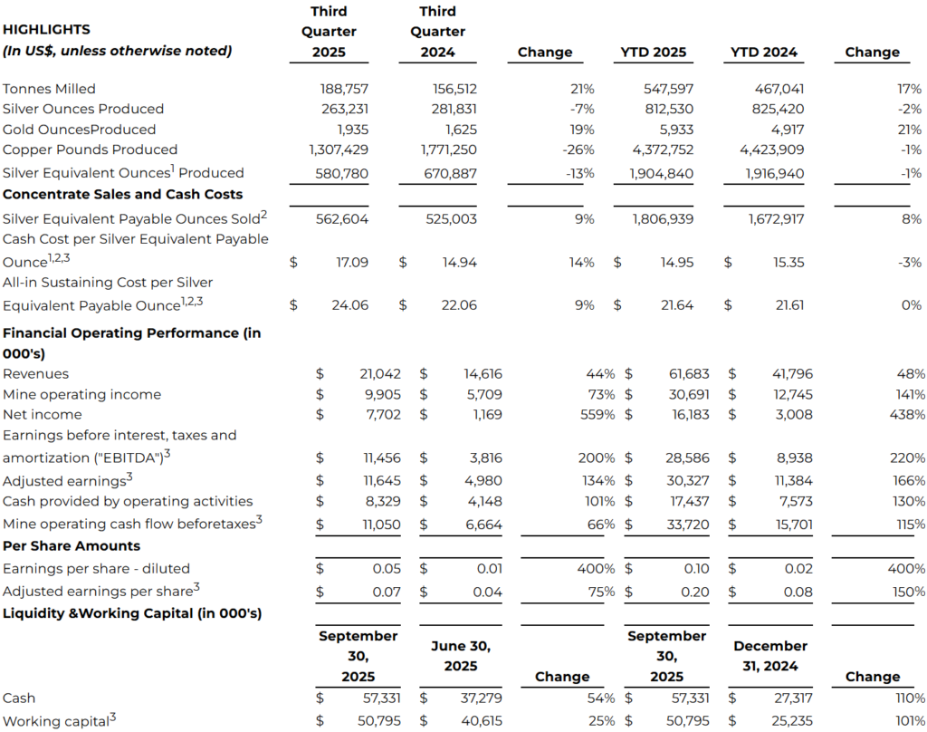 The financial results in this news release include references to non-IFRS Accounting Standards measures. These measures are used by the Company to manage and evaluate the operating performance of the Company’s mining operations and are widely reported in the silver and gold mining industry as benchmarks for performance, but do not have standardized meanings prescribed by IFRS. For a reconciliation of non-GAAP and GAAP measures, please refer to the “Non-IFRS Accounting Standards Measures” section of the Company’s MD&A dated November 6, 2025 for the nine months ended September 30, 2025, which is incorporated by reference within this news release and available on SEDAR+ at www.sedarplus.ca.