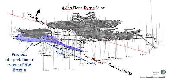 In Figure 1, The previous interpreted extent of the HWB is shown in blue while the sampled HWB intervals referred to in Table 1 are shown in red. The HWB trends eastwards and diverges away from the main Avino vein system (mine workings shown in grey).