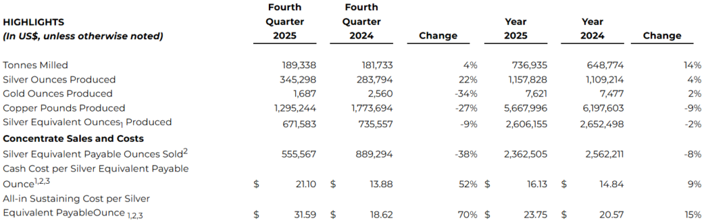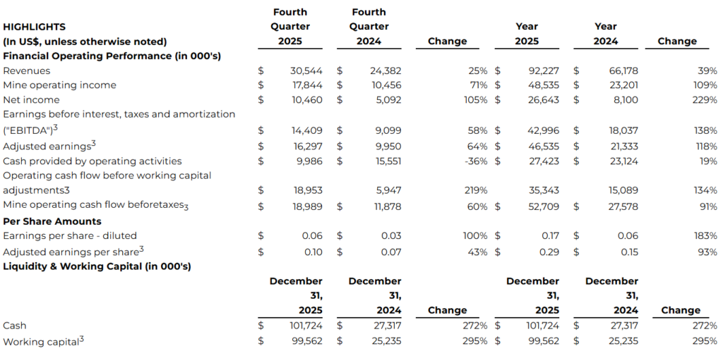 - Record Revenues: The Company achieved a record $30.5 million in revenues for Q4 2025, an increase of 25% from Q4 2024, our previous quarterly record. Further, this quarter represented a return to primary silver production and revenues, with 54% of its revenues coming from silver at an average realized price of $59.52 per ounce.