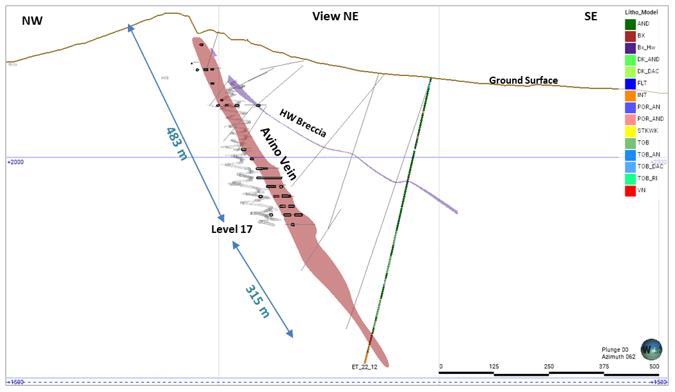 Vein-type mineralization and stockwork containing silver, gold and copper are found along the contacts between intrusive rocks and an andesite. This provides opportunities within the ET Area for the identification and delineation of additional mineral resources that remain open on strike and dip (see Figure 1 for the projections of the resource relative to the drilled holes). This recent deeper drilling confirms that the mineralization persists down dip significantly past the lowest developed mining level and may prove to add substantial mineral resources. An updated mineral resource estimate, up to hole ET-22-13, is currently scheduled for Q1 2023.