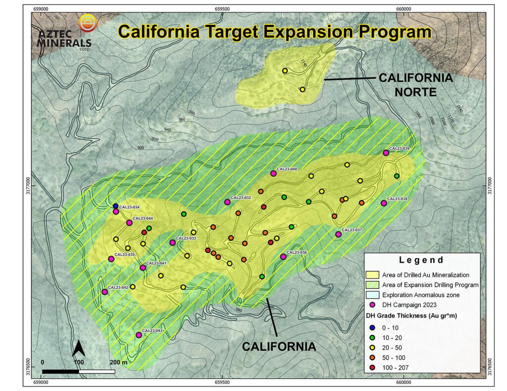 VANCOUVER, BC / ACCESSWIRE / December 20, 2023 / Aztec Minerals Corp. (TSX-V:AZT)(OTCQB:AZZTF) announces the completion of 13 reverse circulation “RC” holes totaling 1,646 meters (m) at its 100% owned Cervantes project in Sonora, Mexico. The RC drilling program was increased from an originally planned 11 holes and RC chip logging of the 13 completed holes indicate favorable geology to support potential expansion of the gold zone mineralization in the vicinities of the area previously drilled (Figure 1.). The 13 holes were drilled on the primary California gold zone target with step out drilling focused on expanding the zone to the north, west, east and south of previous drilling where Aztec had discovered extensive shallow, wide oxide gold mineralization (please see summary news release dated January 10, 2023).