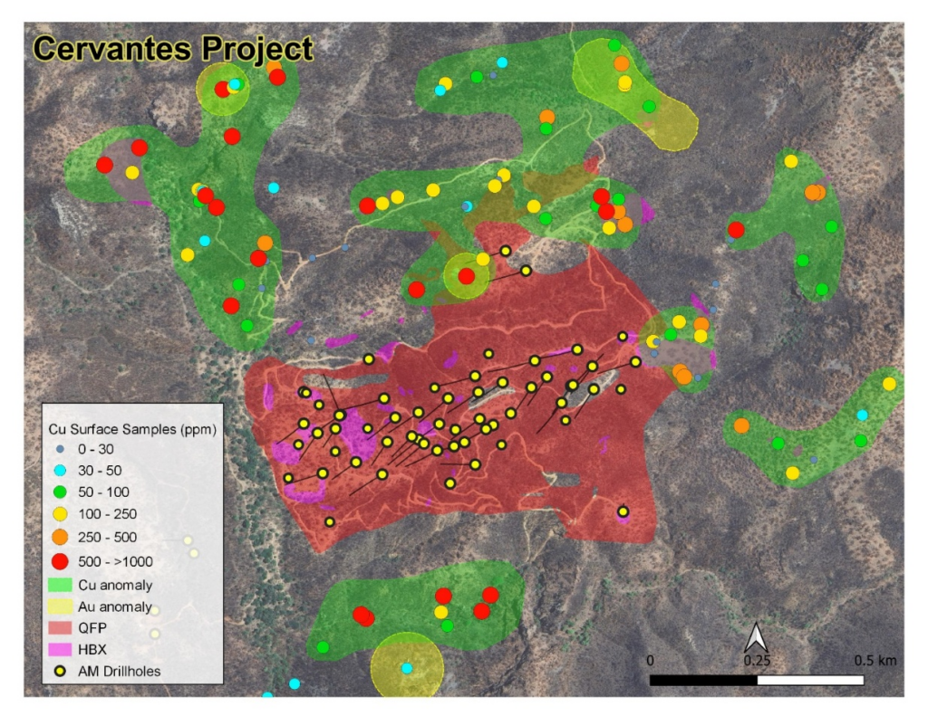 The initial surface exploration mapping and sampling program has found numerous exposures of mineralized hydrothermal breccias, Quartz Feldspar porphyries and the siliciclastic country rocks and associated mineralized structures with strong Au and Cu values beyond the exposed California Au-Cu porphyry (see Figure 2).