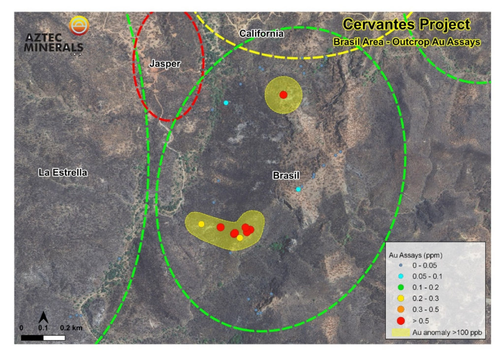 Aztec has now completed an initial phase of its 2025 surface exploration program comprised of reconnaissance outcrop sampling and geological mapping of several targets at the 3,649 hectare, 100%-owned property. The program was focused on three high-priority gold mineralization target areas of California East, California North, and the Brasil target, as well as additional work in other adjoining portions of the Cervantes project (see Figure 1 below).