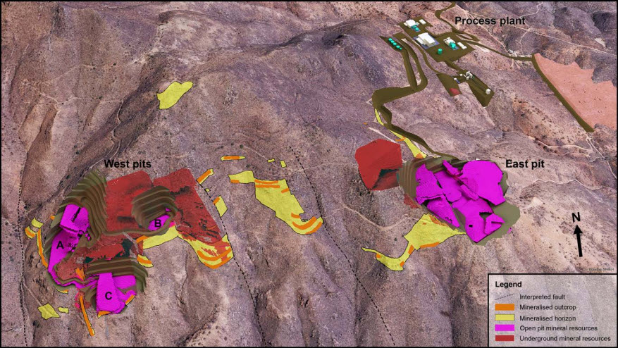 When factoring in topography, together with grade and width characteristics of the mineralised zones, the mining study demonstrates that resource extraction and project economics are optimal with a single open pit on the East Zone and three open pits on the West Zone, followed by underground mining of both deposits.