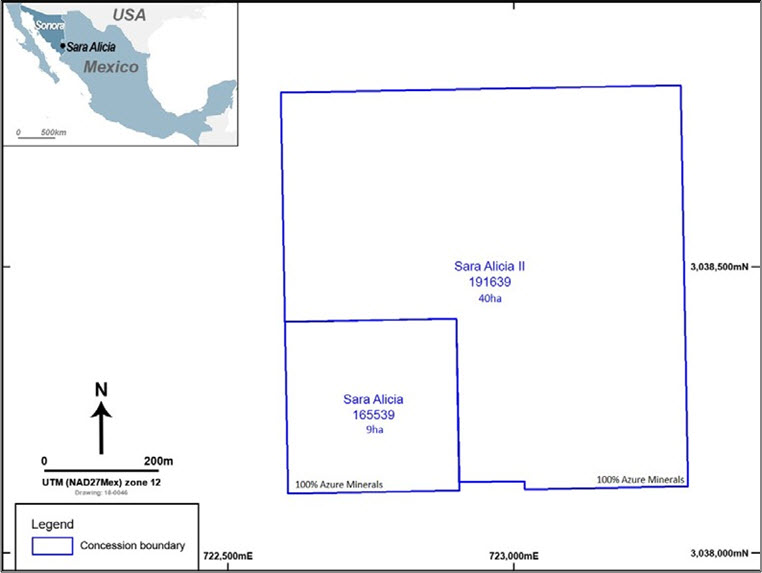 Azure Minerals Limited (ASX: AZS) (“Azure” or “the Company”) is pleased to announce that it successfully overturned an historical cancellation of the Sara Alicia II mineral concession that adjoins the Company’s 100%-owned Sara Alicia property and has completed the acquisition of this property. The Sara Alicia project is located in the northern Mexican state of Sonora (see Figure 1).