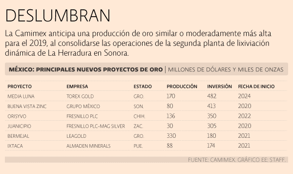 La Camimex anticipa una producción de oro similar o moderadamente más alta para el 2019, al consolidarse las operaciones de la segunda planta de lixiviación dinámica de La Herradura en Sonora, así como Piritas de Fresnillo plc, Piritas de Goldcorp y El Compás de Endeavour Silver.