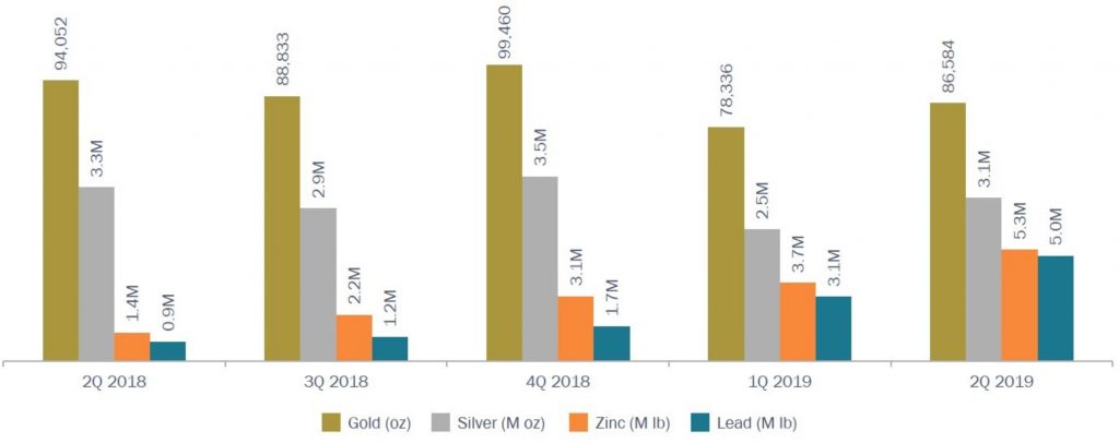 - Full-year 2019 production guidance is unchanged at 1.5 – 2.5 million ounces of silver, 25 – 40 million pounds of zinc and 20 – 35 million pounds of lead