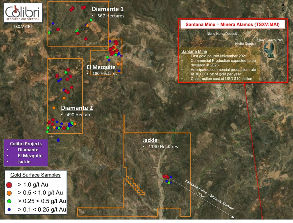 Ron Goguen, President & CEO commented: We have been focussed on our Caborca Gold Belt properties over the last few months and are pleased to be getting back to the Sierra Madre and our Diamante property. We will be further assessing existing targets & developing new ones with a grass-roots approach. Furthermore, Colibri will be assessing and prioritizing targets and work programs across our complete property position in the Sierra Madre epithermal belt which includes the Diamante, Mezquite, and Jackie properties.