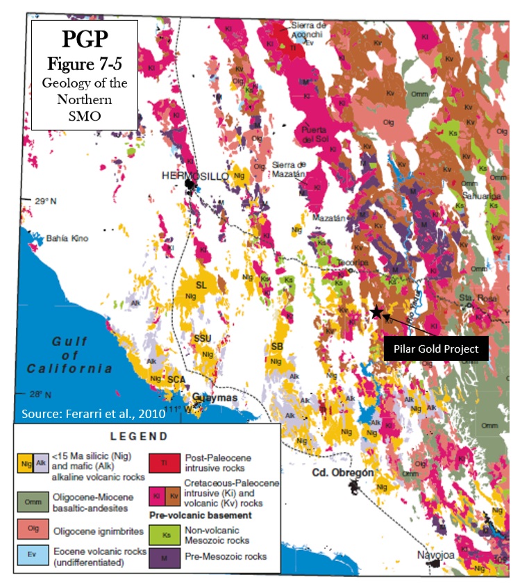 The Pilar Gold-Silver property is interpreted as a structurally controlled low-sulphidation epithermal project hosted in andesite and rhyolite rocks. Three zones of mineralization have been identified in the north-west part of the property from historic surface work and drilling and are referred to as the Main Zone, North Hill and 4 Trench. Structural features and zones of mineralization within the structures follow an overall NW-SE trend of mineralization.