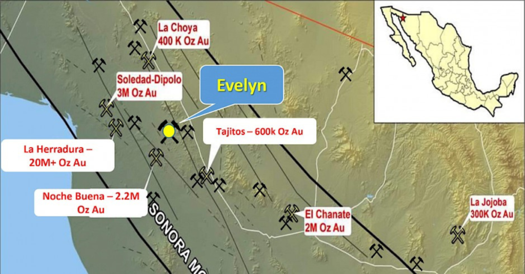 The Evelyn Gold Project is an Orogenic-type gold target located in the Caborca Gold Belt of northwestern Sonora. The property is located approximately 25 kilometres (“km”) east of La Herradura, Mexico’s largest open pit gold mine, which produced 425,288 ounces of gold in 2020 at an average grade of 0.77 grams per tonnes (“g/t”) Au and is also approximately 9 km northeast of the Noche Buena mine which produced 87,988 ounces Au at an average grade of 0.52 g/t Au in 2020. The setting and style of mineralization at Evelyn is similar to that reported from La Herradura and Noche Buena. Higher grade mineralization on the Evelyn property consists of quartz veins and veinlets, ranging from 2 – 3 centimeters up to 1.5 m hosted by fault and fracture zones with minor oxidized pyrite, iron oxide, copper bearing oxide and carbonate minerals, and locally minor to trace amounts of galena, chalcopyrite, and sphalerite. Alteration of the host rocks includes iron bearing carbonate minerals, quartz, sericite, and chlorite. Lower grade mineralization is associated with altered volcanic rocks containing minor amounts of oxidized sulfide. Mineralization is hosted dominantly by Jurassic volcanic rocks consisting of andesite and rhyolite.