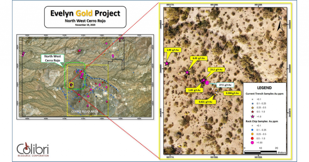 NEWS RELEASE – Dieppe, NB. November 19th, 2020. (CBI-TSXV) Colibri Resource Corporation (“Colibri” or the “Company”) is pleased to announce that the Company has received the second batch of assays from the trenching program completed on the Evelyn Gold Project, located in the Caborca Gold Belt, northwestern Sonora.   Significant results include an assay of 23.2 grams per tonne (“g/t”) Au from the Cerro Rojo target area.