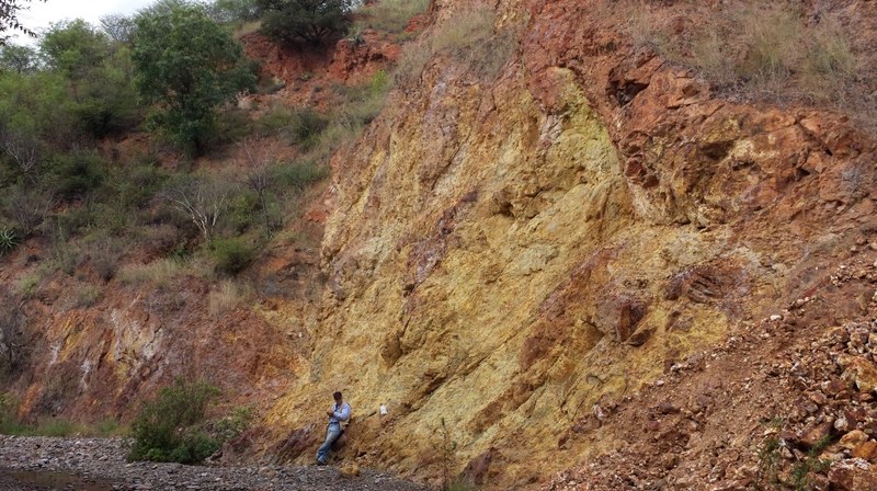 El Mezquite contains a broad alteration zone that extends for about 2 km in north/south direction, by 1 km east/west width. Within the broad alteration zone are at least four colourful (after oxidizied sulfides) hydrothermally altered contact zones about a silicified feldspar porphyry. The distinct gold and silver values and geophysical anomalies reported in the El Mezquite area are mostly associated with these zones of sulphide alteration.