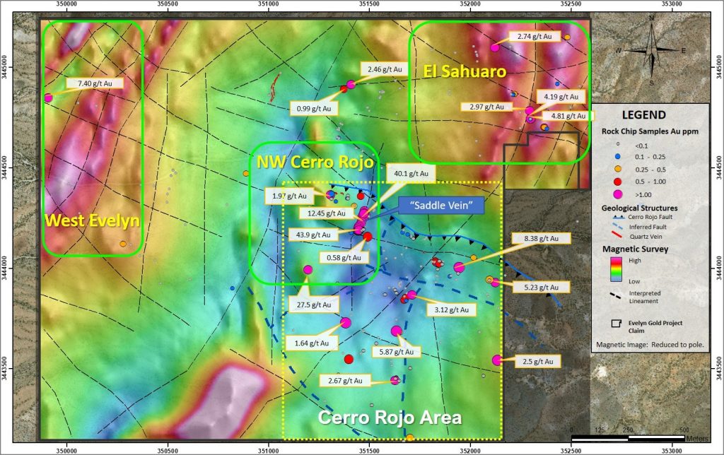 The Company is currently evaluating the magnetic survey and interpretation completed by Geo Digital with the historical project data that includes geological mapping, 341 chip and channel samples, property wide soil samples, and 5 drill holes. The NW Cerro Rojo target area identified by Geo Digital includes the north-south trending “Saddle Vein” which has returned assays up to 43.1 g/t Au and has a mapped strike length of approximately 100 metres (“m”). The vein is coincident with a north-south trending magnetic low and an interpreted lineament which extends to the north and south and includes historical samples of up to 1.64 grams per tonne (“gpt”) Au to the south (attached map). The West Evelyn and El Sahuaro target areas are both characterized by high magnetic gradients and both are characterized by high grade samples of outcrop and sub-crop and domains of anomalous soil samples. The West Evelyn target area, located in the NW corner of the property, includes a sample of sub-crop which returned 7.4 g/t Au and soil samples from the target area grade up to 2.274 g/t Au. The El Sahuaro target area includes grab samples of outcrop and sub crop up to 4.81 gpt Au.