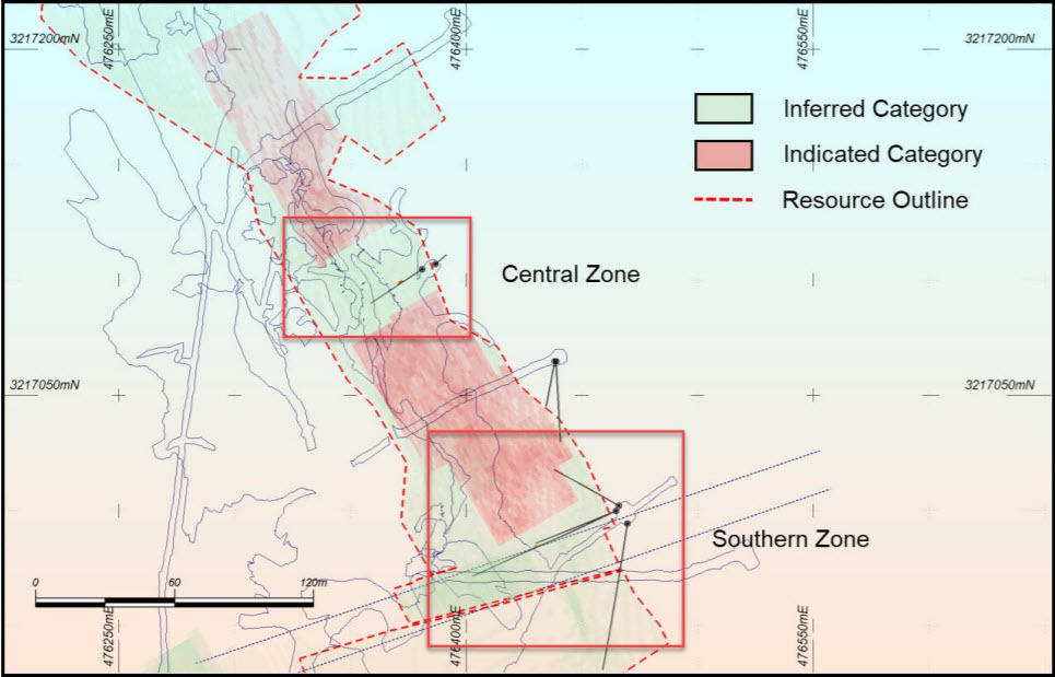 The main zones targeted by drilling and channel sampling are shown in Figure 1, which illustrates the areas of Inferred that were drilled and sampled to convert to Indicated Category. Results from this drilling and channel sampling have converted sections of the Inferred Category resources to Indicated Category totalling 26,000 tonnes at 22.6% Zn, 12.8% Pb and 72.5g/t Ag.