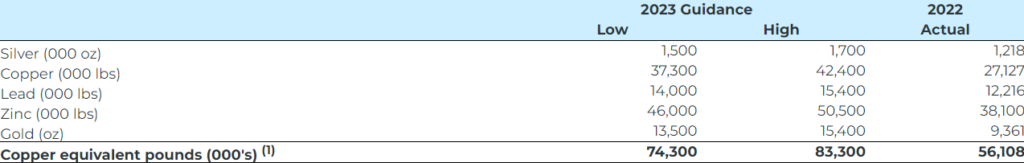(1) 2023 metal equivalent guidance was calculated using the following prices: $21.03/oz Ag, $3.55/lb Cu, $1.35/lb Zn, $0.93/lb Pb and $1,741/oz Au.