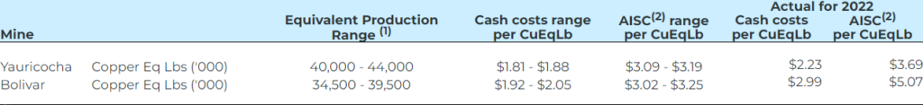 The table summarizing 2023 production guidance from the Yauricocha and the Bolivar mines is provided below. Management considers the Cusi mine as ‘non-core’ and it has been excluded from the guidance.