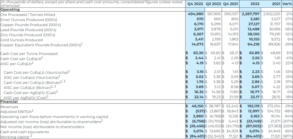 - Net loss attributable to shareholders for 2022 was $87.5 million or $0.53 per share (2021: net loss of $27.4 million, $0.17 per share). Net loss for the year ended 2022 includes an impairment charge of $25.0 million on the Bolivar mine and $25.0 million on the Cusi mine (2021: impairment of $35.0 million on the Cusi mine);